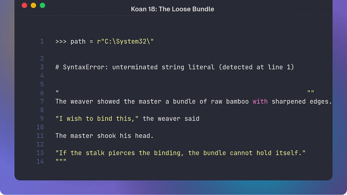 monica_b1998@lemmy.worldEnglish · 10 hours agoKoan 18: The Loose Bundleplus-squarepythonkoans.substack.comexternal-linkmessage-square0linkfedilinkarrow-up12arrow-down10