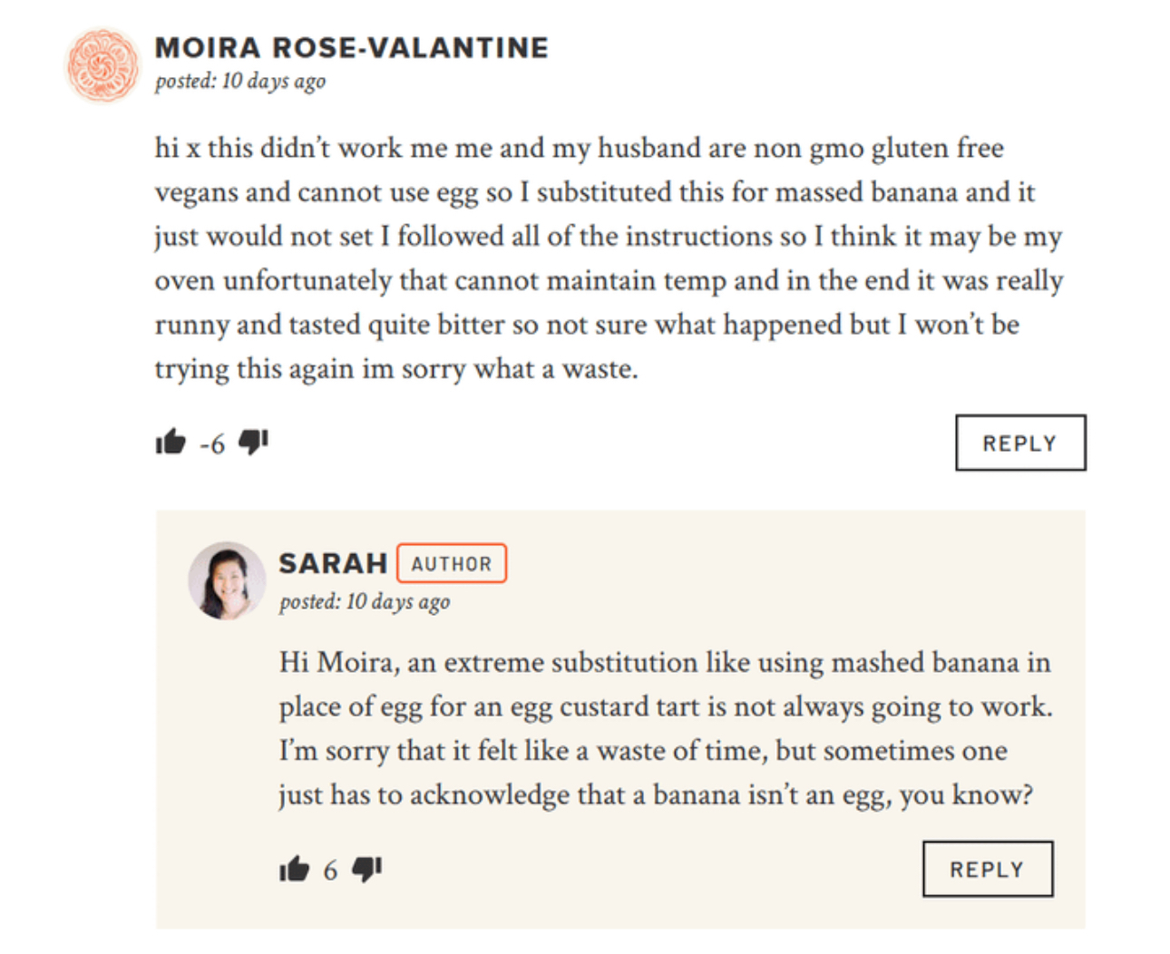 Also the reply says the recipe is for an egg custard tart. Why would a vegan even be looking at a recipe like that?